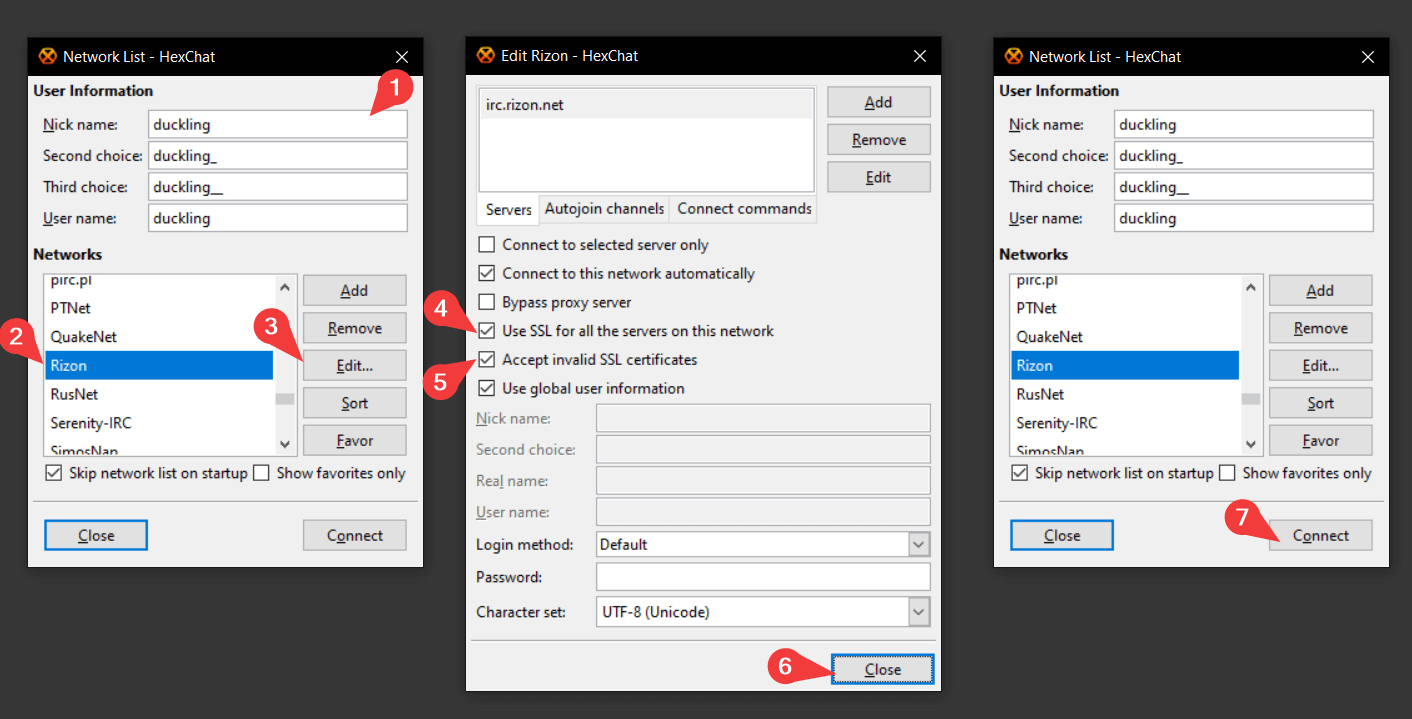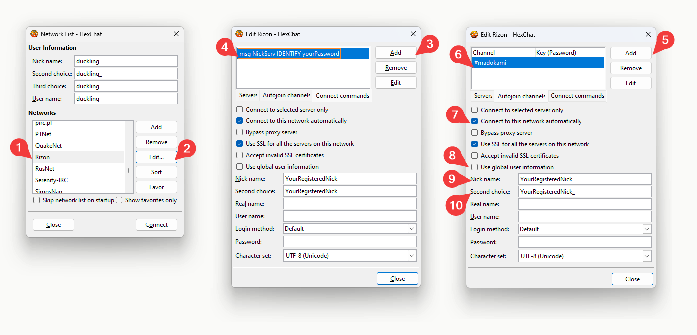 Ctrl + Sto open Network List & select Rizon in the network list - Click Edit