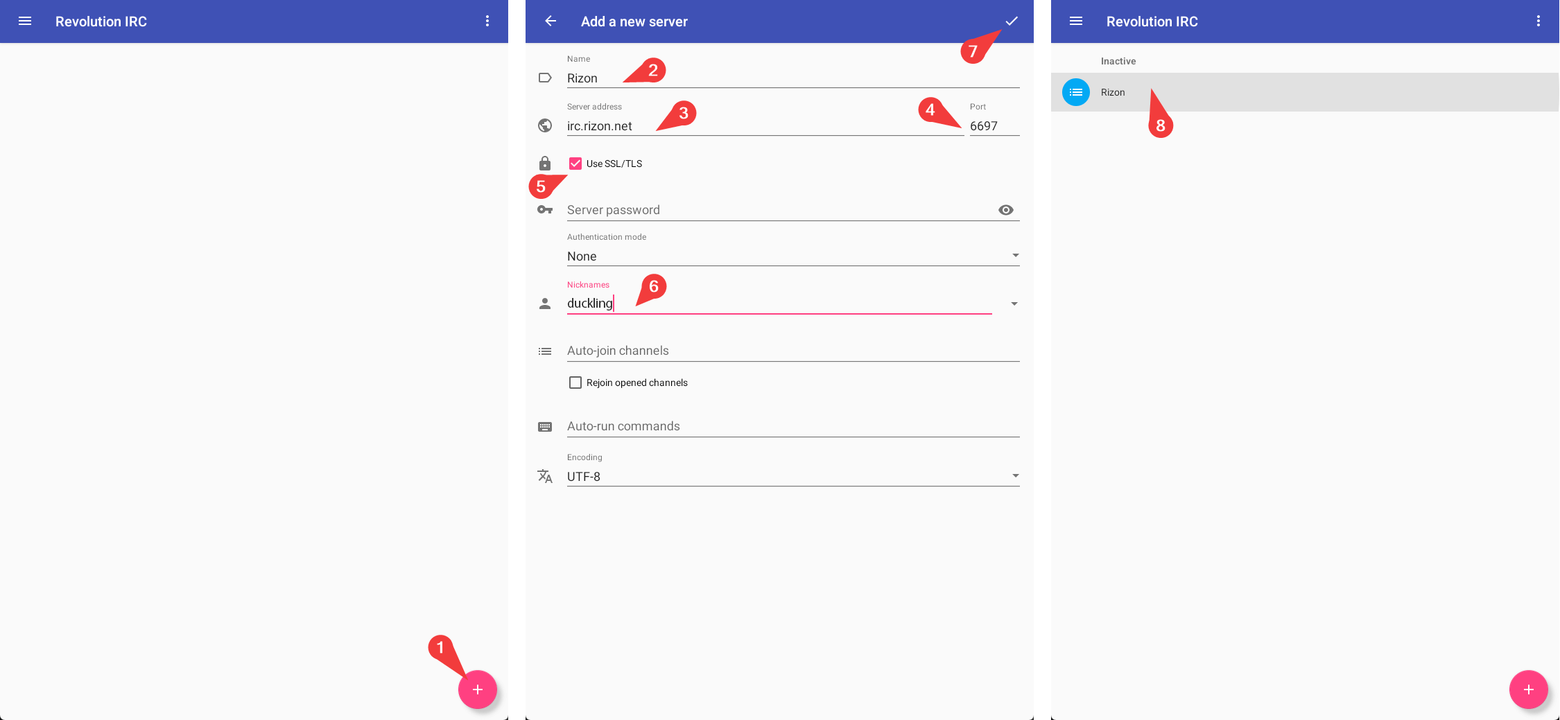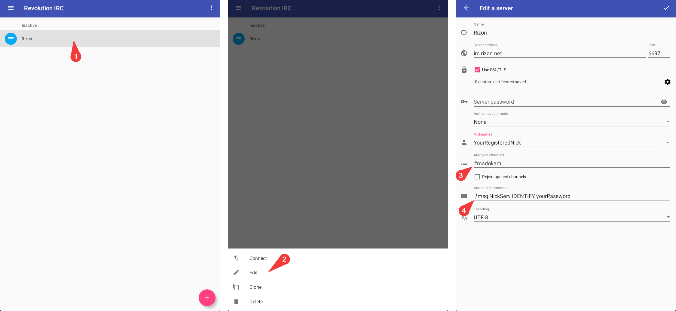 By default, Revolution IRC doesn't list any networks, so you will need to add Rizon manually by following these steps: