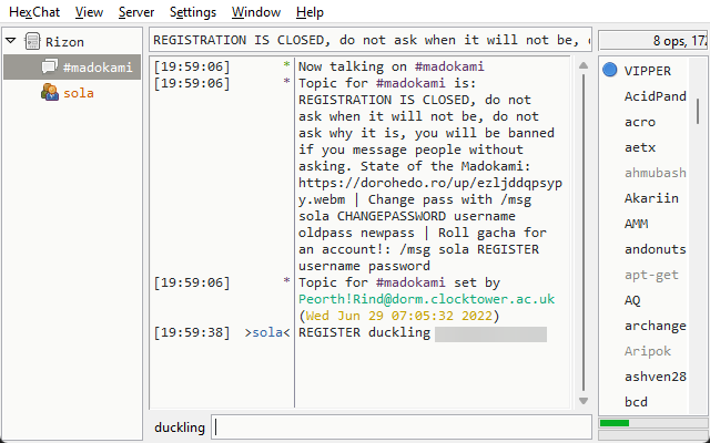 Now, your nickname is registered, and you've automatically been identified. You are eligible to join Madokami. Upon your next visit to Rizon IRC network, use the same nickname, and identify using the following command: /msg NickServ IDENTIFY yourPassword