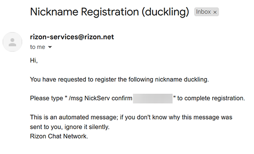 /msg NickServ REGISTER yourPassword your@email.address - Now you should get a confirmation code like this
